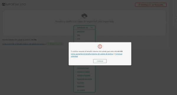 Si tu copia ocupa más de 64Mb te «mostrará» una ventana donde te avisa de que no es posible la importación.