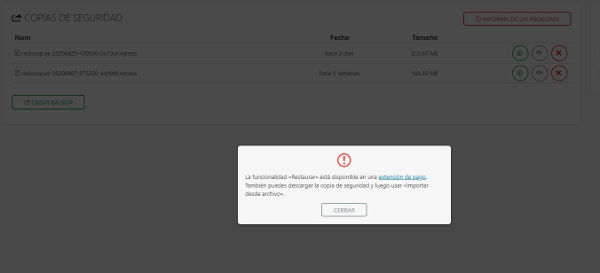 Si tienes la versión Free de All-in-One WP Migration y clicas en «restaurar» te mostrará una ventana emergente informándote de que solamente está disponible para la versión de pago.